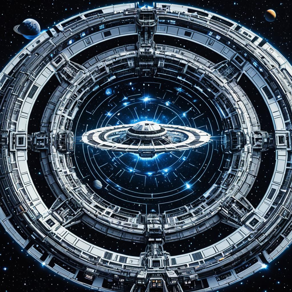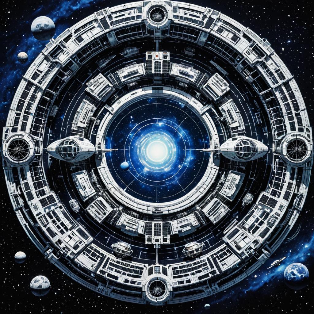 Detailed digital illustration of a large circular space station with an infinity-like design, surrounded by a cosmic background filled with stars and planets. The image features sleek, translucent, energy-based spaceships in glowing silver and blue hues, with radiant pulsar stars enhancing the vibrant outer space atmosphere.