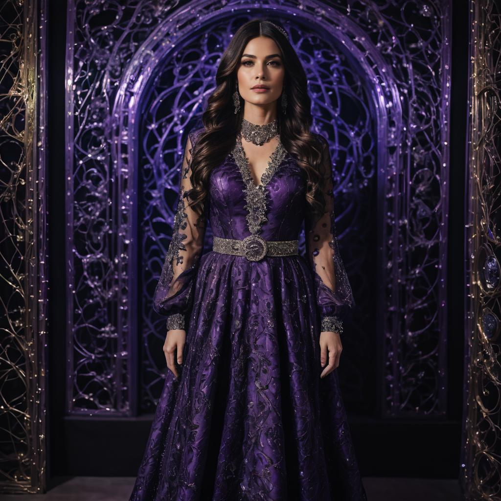 Full body studio portrait of a stunning woman with long dark wavy hair. She is wearing a royal purple crushed velvet corseted bodice gown with a feathered skirt bottom. The waist is adorned with a belt of pearls and intricate green beading. smoky jazz club stage under blue light, high fashion photography, photorealistic, 8k, sharp focus, glamour shot.