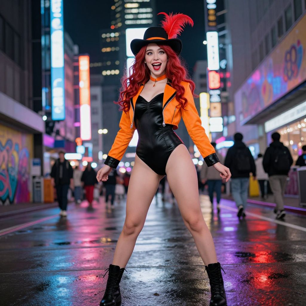 Photograph of a smiling woman with long red hair, wearing a black hat with a red feather, an orange jacket over a black, high-cut leotard, and black ankle boots. She stands confidently in the middle of a bustling, neon-lit city street at night, with colorful graffiti on the buildings and people in the background. The street is wet, reflecting the vibrant lights. Her outfit and pose evoke a playful, burlesque style. The background includes tall buildings with illuminated signs and a slightly blurred crowd. The overall scene is energetic and lively.