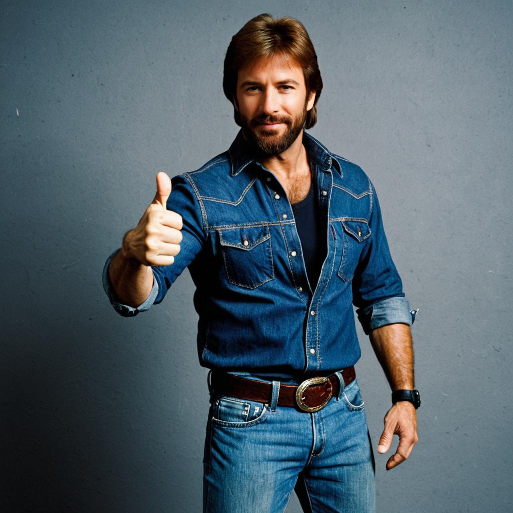 Chuck Norris, Chuck Norris cosplay costume, rugged beard, short brown hair, denim shirt, thumbs up pose, full body shot