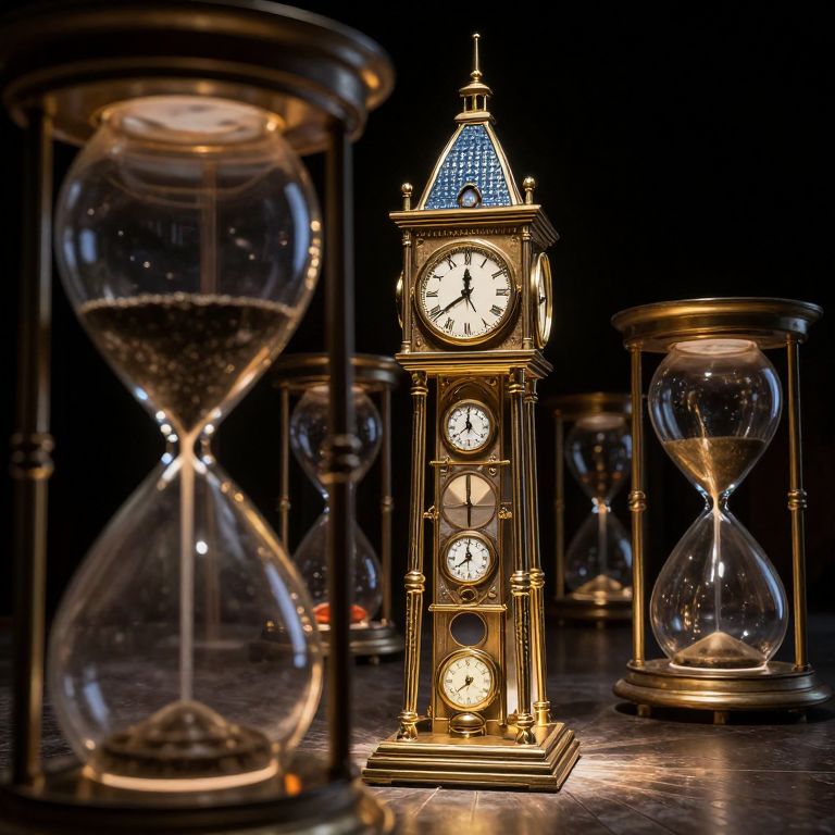 Photograph of an illuminated, ornate clock tower surrounded by glowing hourglasses against a dark background, highlighting time's passage.
