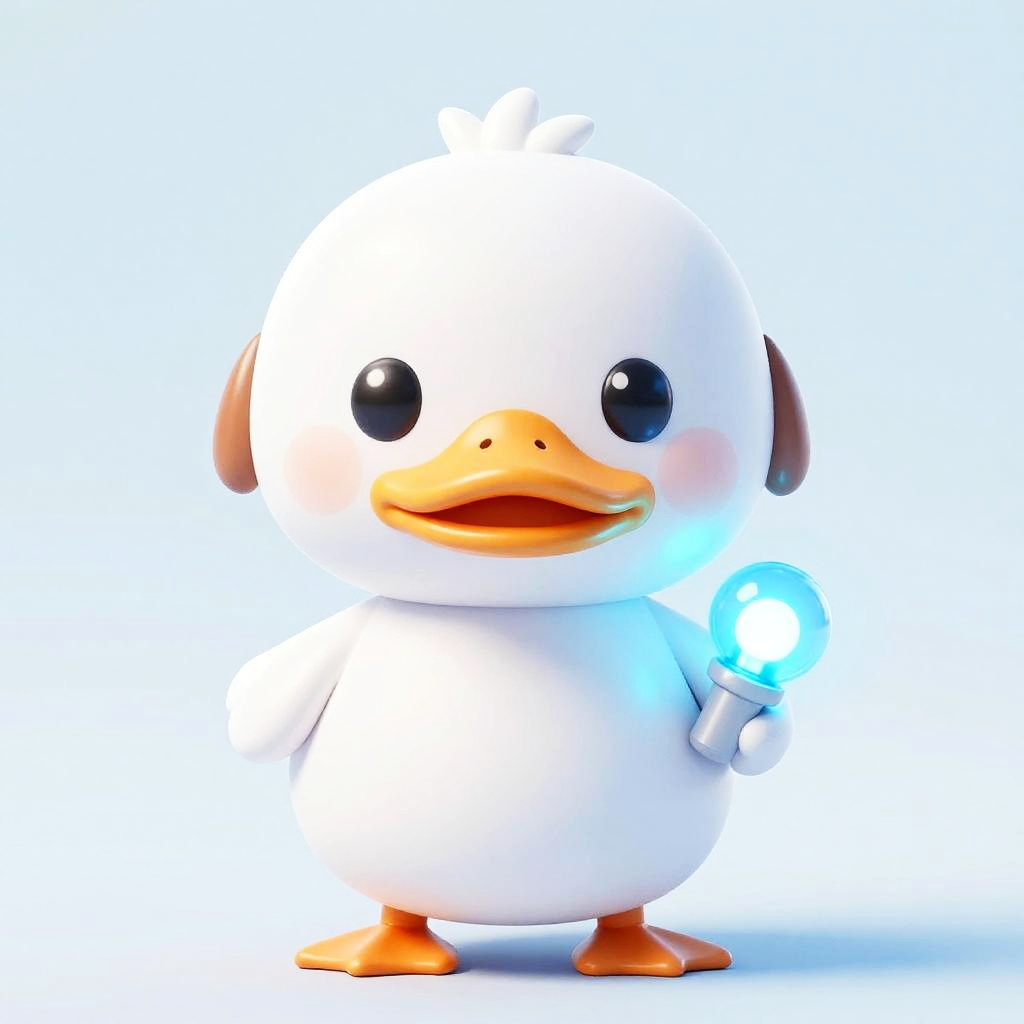 This is a digital rendering of a cute, cartoonish rubber duck with a shiny white body and large, black, round eyes. It has an orange beak and small, triangular teeth. The duck has brown ear-like appendages and is holding a glowing blue light in its right wing. The background is a simple, light blue gradient, and the duck is centered on a white surface.