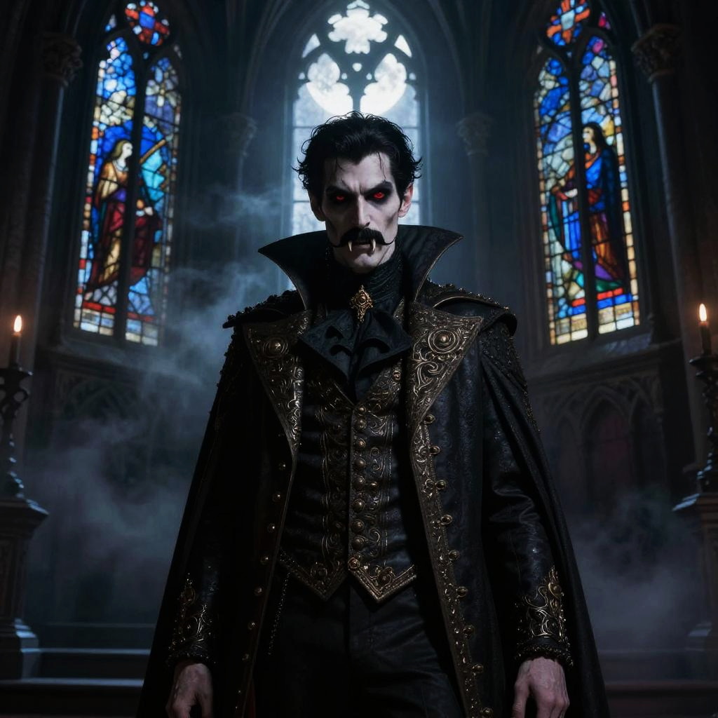 Vampire with mustache standing in a dark gothic castle, moonlight filtering through stained glass windows, intricate Victorian clothing, sharp fangs, intense red eyes, eerie mist surrounding, detailed and atmospheric digital art style