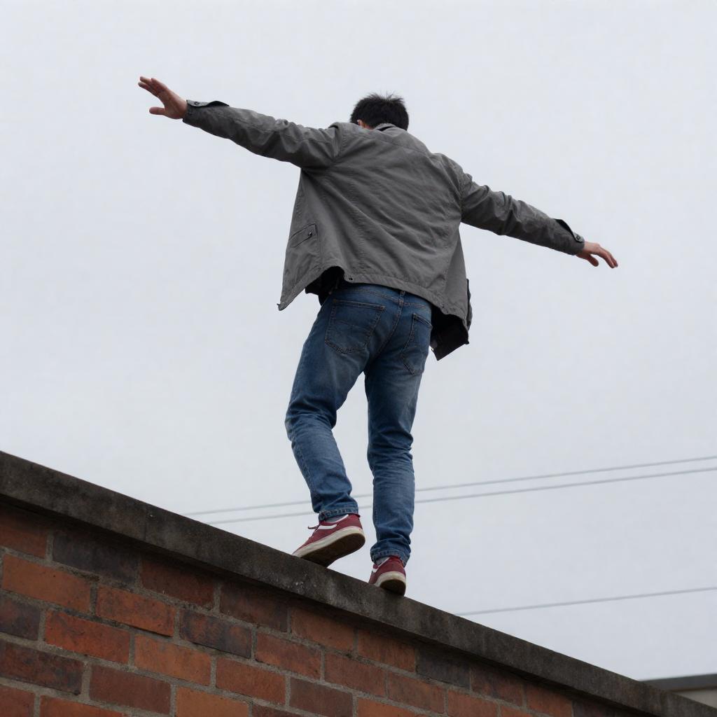Silhouetted figure in dark cloak standing under brick archway, facing a cloudy, blue-gray sky. Background: old brick buildings, flags, flying birds, scattered people on green field. Overcast lighting, mysterious atmosphere. Figure centered, cloaked, hood up.
