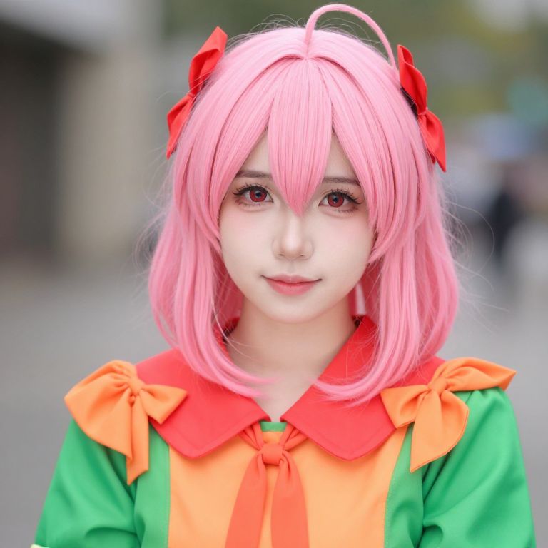 Girl with pink hair, wearing a green and orange outfit with a red collar and orange bows on the shoulders.