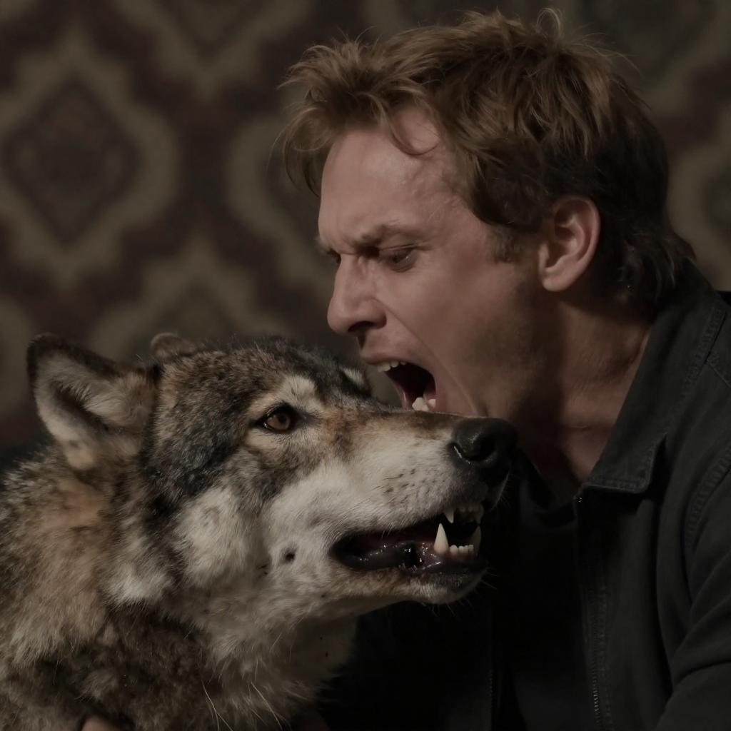 Photograph of a man with light brown hair, open mouth in shock, being bitten by a wolf-like creature. Dark fur, intense bite. Patterned background, dark clothing. Close-up, dramatic interaction. One person, intense facial expression.