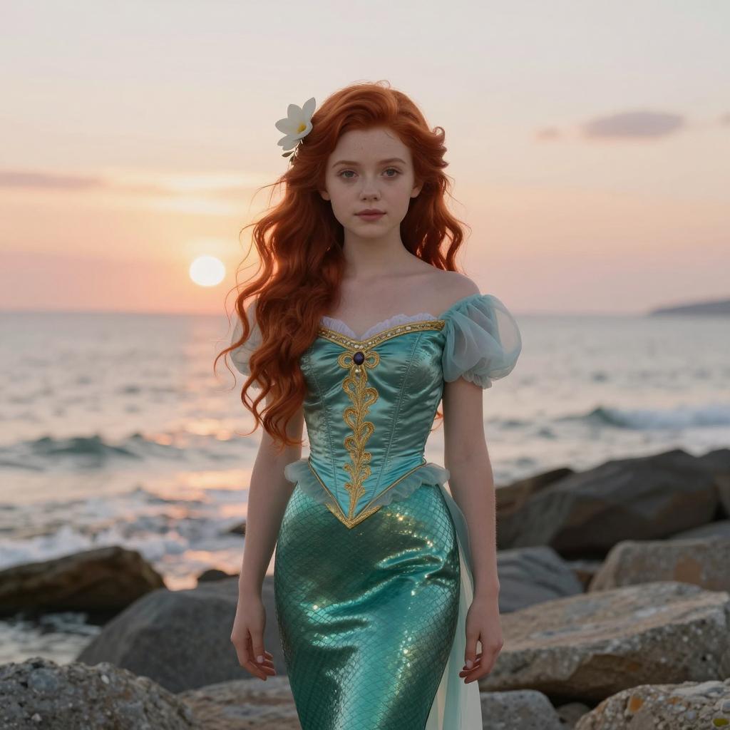 Little mermaid birthday, photograph of a young woman with long brown hair, wearing a mermaid costume, strapless top with purple and blue scales, turquoise skirt with scale pattern, standing outdoors, sunny day, blurred blue and white building in background, potted plant on the right, neutral expression, realistic, casual pose, natural light, detailed costume ures, medium shot, confident stance