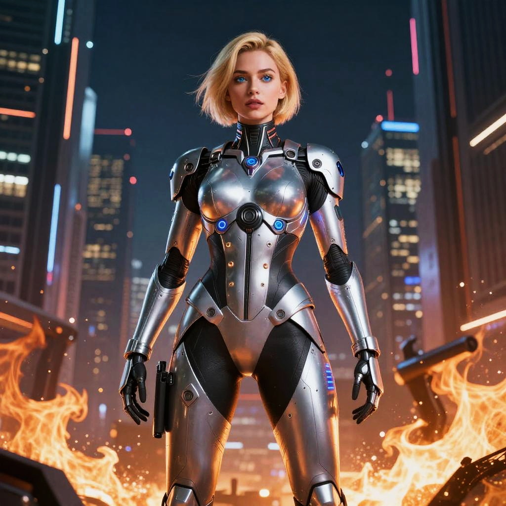 CGI image of a blonde, blue-eyed female cyborg standing confidently in a futuristic cityscape at night. She's wearing a sleek, silver and black armored suit with colorful LED lights on her chest and shoulders. Her short hair is neatly styled. She stands amid bright orange flames, with tall, illuminated skyscrapers in the background. The scene is dynamic and high-tech.
