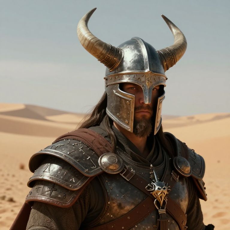 Photograph of a man in Viking-style armor standing in a desert. He wears a metallic helmet with large, curved horns and a face guard that partially obscures his bearded face. His armor is dark, adorned with rivets and leather straps, and features a central pendant. The background shows a clear blue sky and sandy dunes. The man's long, dark hair flows from beneath the helmet. The sunlight casts a bright reflection on his helmet, highlighting its polished surface. The overall scene evokes a sense of medieval fantasy in a desert setting.