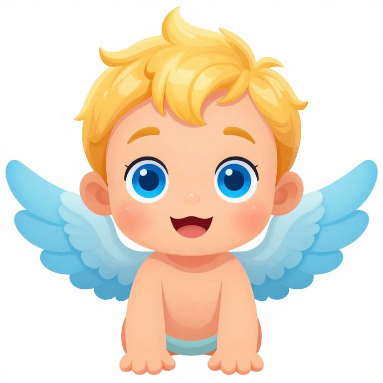 A charming cartoon-style illustration depicts a baby boy with golden hair and bright blue eyes, adorned with light blue wings, exuding a playful and whimsical vibe through its vibrant colors and detailed digital artistry.