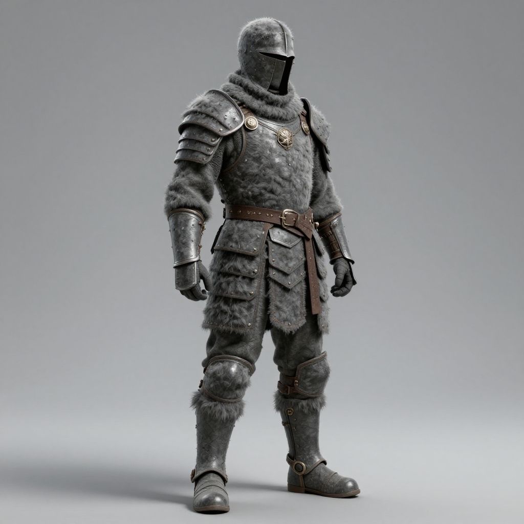 Hyper-realistic, Realism, HDR, detailed, warior style armor covered in gray wool, armor with pants with boots, simple gray background