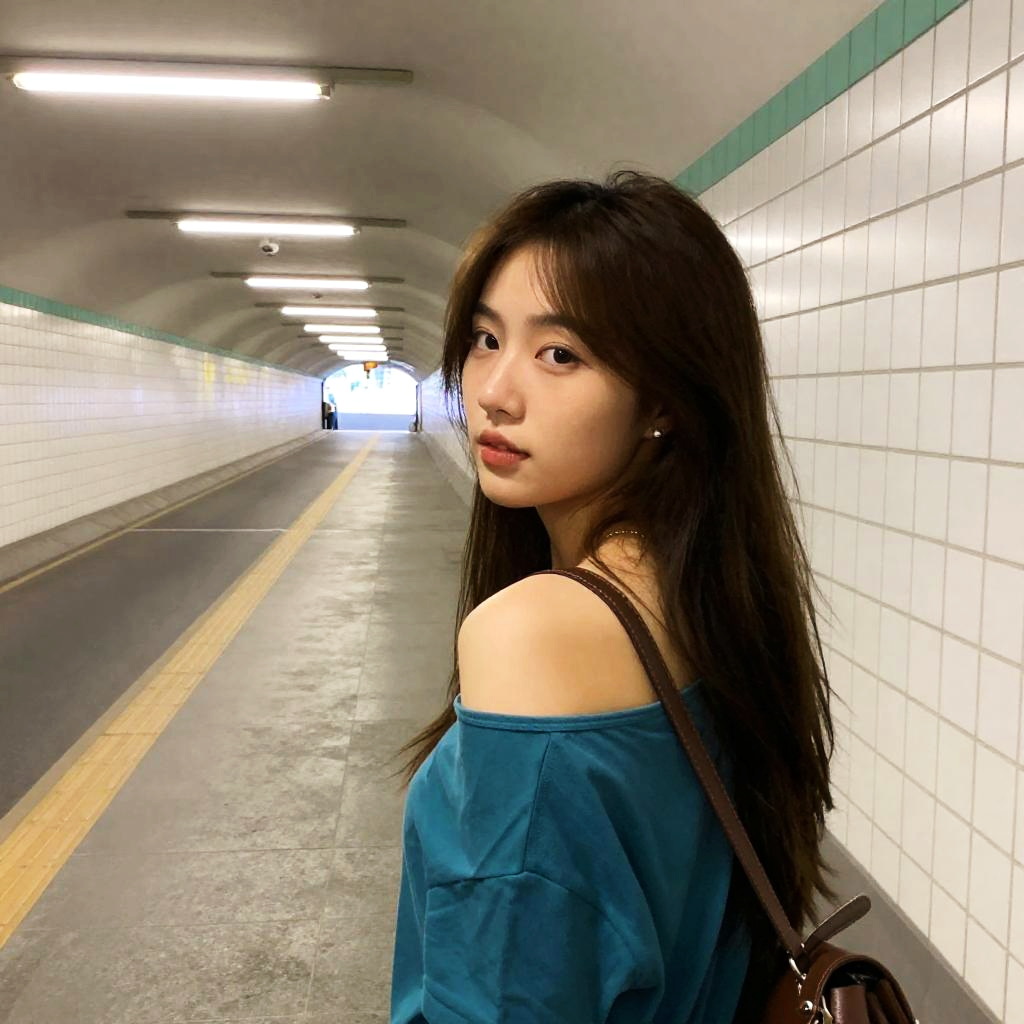 Young Asian woman with long brown hair, wearing a teal off-shoulder shirt and a brown strap bag, looks back over her shoulder. She is in a long, white-tiled subway tunnel with green trim and fluorescent lights. Concrete floor with yellow tactile strips. Mid-ground, the tunnel extends into the distance, creating a perspective effect. She is positioned in the left foreground.