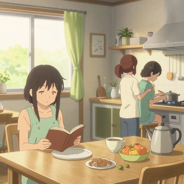 Art style anime depicting a peaceful slice-of-life moment, a cozy room with warm natural light, characters engaged in daily activities like reading or cooking, soft pastel colors, detailed interiors, inviting and heartwarming atmosphere with subtle emotional undertones.