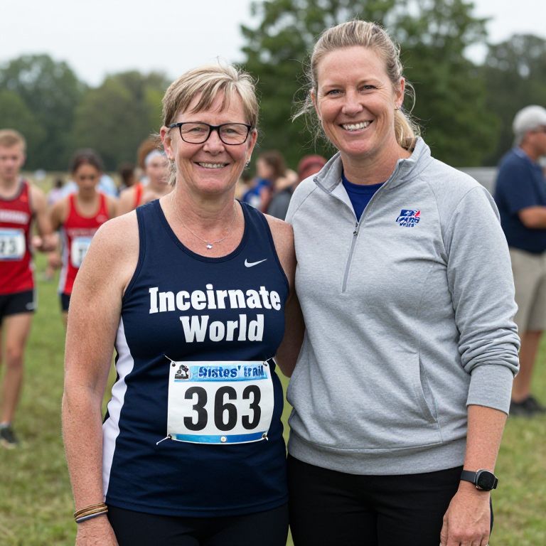 Photograph of two smiling middle-aged women at a race; one in a black "Incite World" tank top (number 36), the other