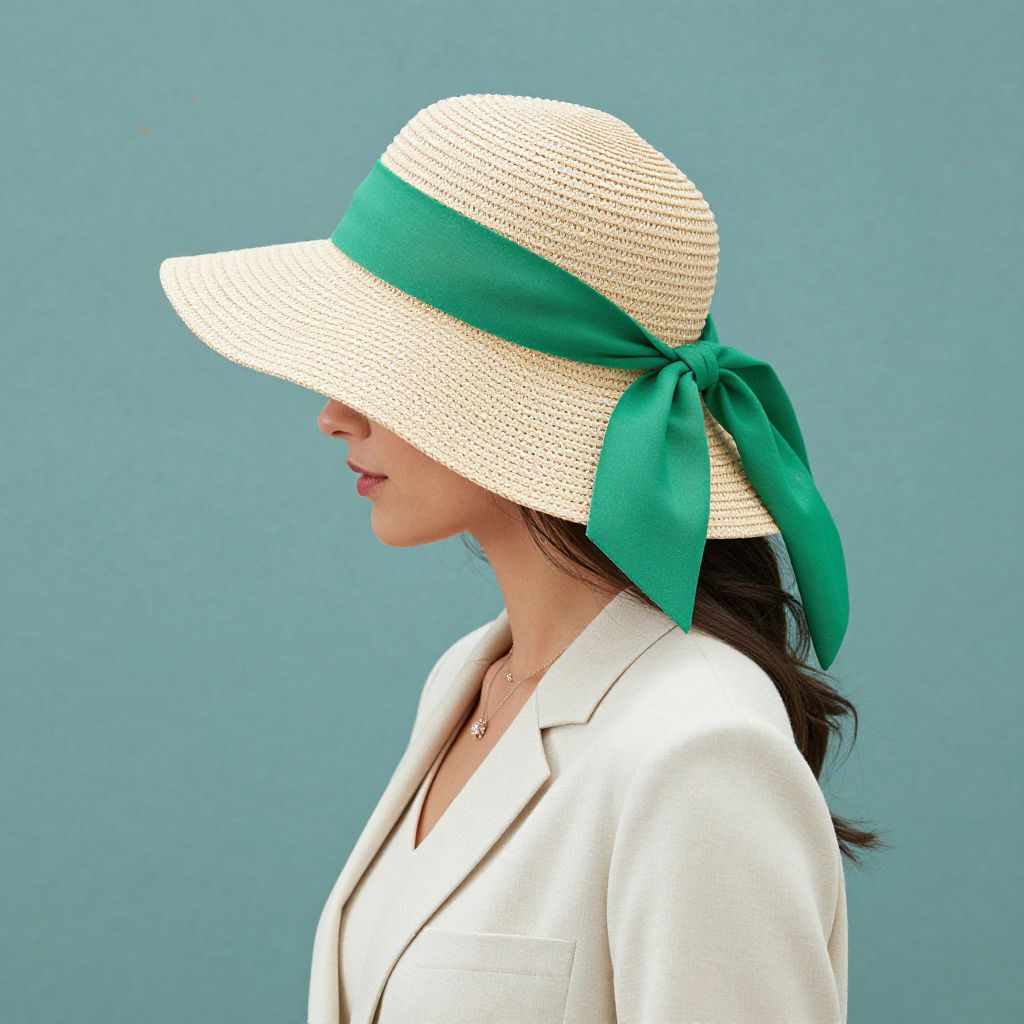 Photograph of a woman in profile, wearing a wide-brimmed, beige straw hat with a large, vibrant green ribbon and bow. She has long, dark hair and is dressed in a white, textured, long-sleeve top with a V-neck, and a delicate gold necklace. Her lips are painted red. The background is a solid, teal-blue color, creating a contrast with her hat and top. The image is sharply focused, highlighting the textures of the straw hat and the fabric of her top. The overall style is casual yet elegant.