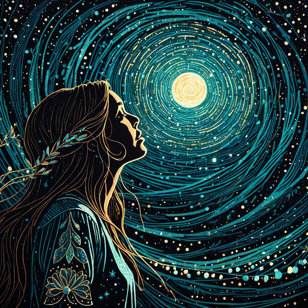 Highly detailed digital artwork depicting an ethereal woman with long flowing hair adorned with delicate leaf-like ornaments. She gazes upward towards a bright luminescent spiral of stars, embodying a dreamlike, mystical atmosphere. The image is luminous, with swirling blue and gold tones capturing a celestial and shimmering theme.