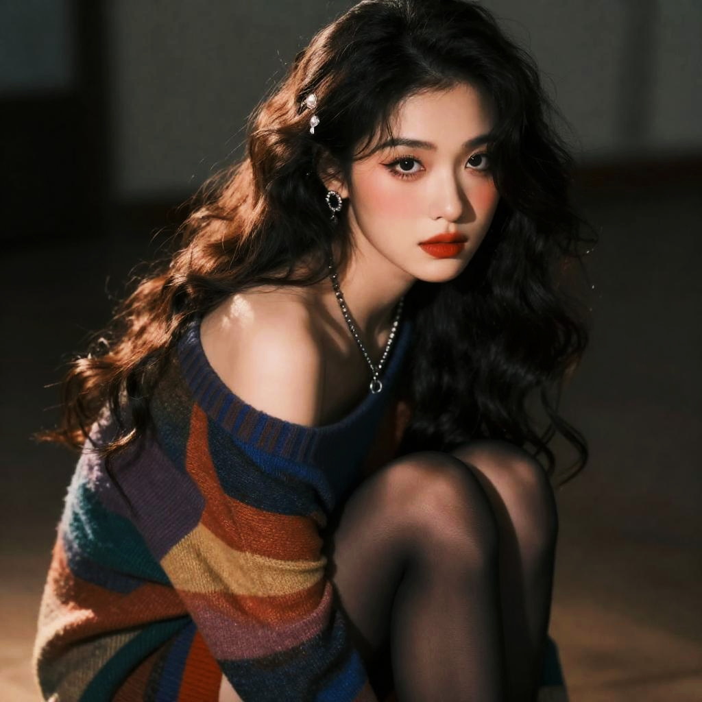 Vintage jazz singer wearing a ruby sequined headscarf, sitting in a smoky late-night jazz club