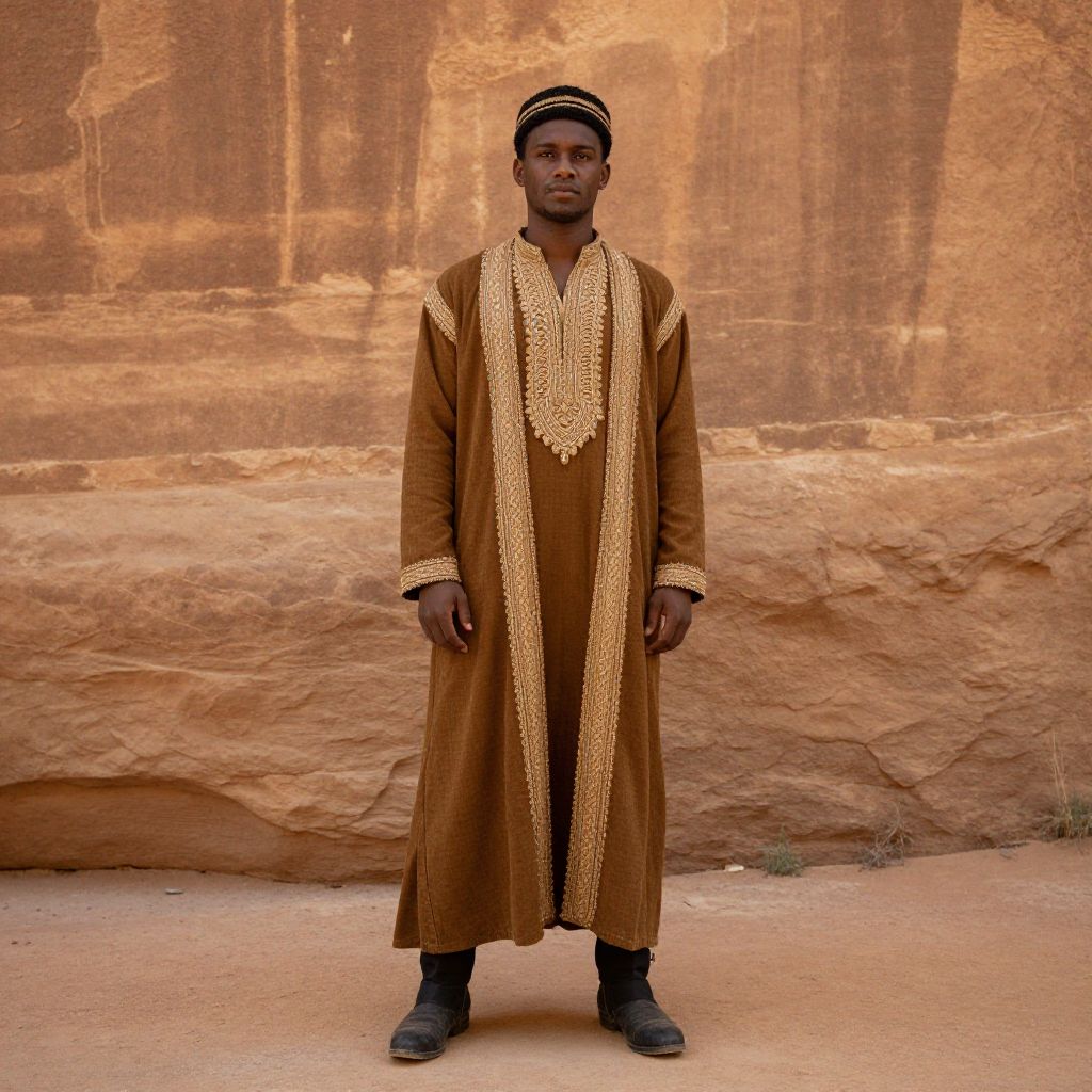 Berber Costume, man in a desert outfit standing in front of a rock wall