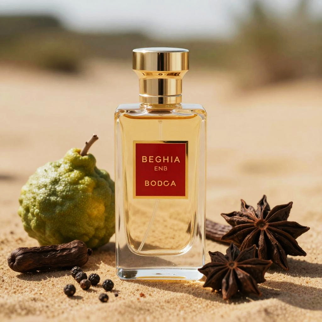 Photograph of a clear, square-shaped perfume bottle with a gold cap and a red label reading "BECHIA EN BODCA" in white text. The bottle is filled with a golden liquid. It is positioned on a sandy surface with a green, textured pear to the left, several black peppercorns in front, and two star anise pods to the right. The background is blurred, showing a sunlit, sandy outdoor area with hints of greenery. The overall lighting is warm, highlighting the golden hue of the liquid and the textures of the objects.