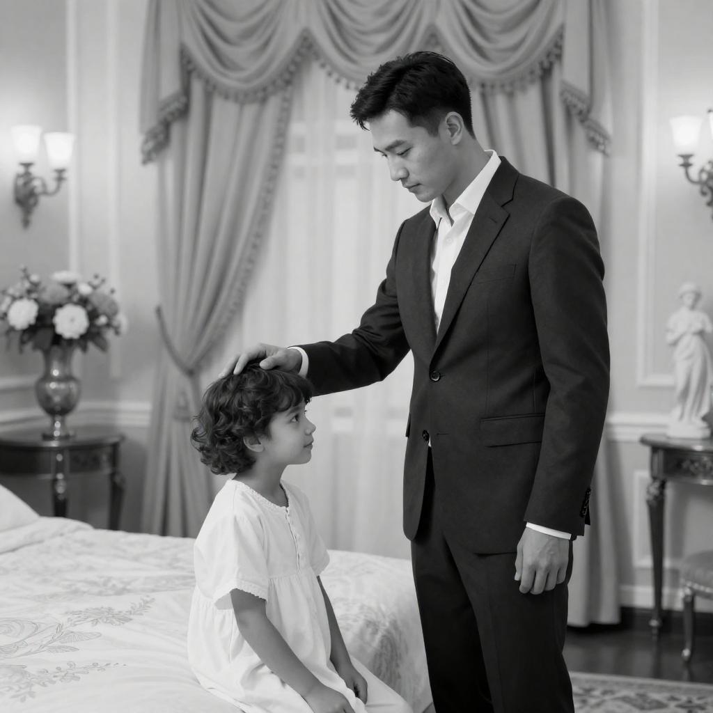 Black-and-white photograph of a man in a dark suit gently touching the head of a child in a white nightgown, standing in front of a bed with ornate, draped curtains in an elegant, classical room. A vase of flowers and a statue are in the background.