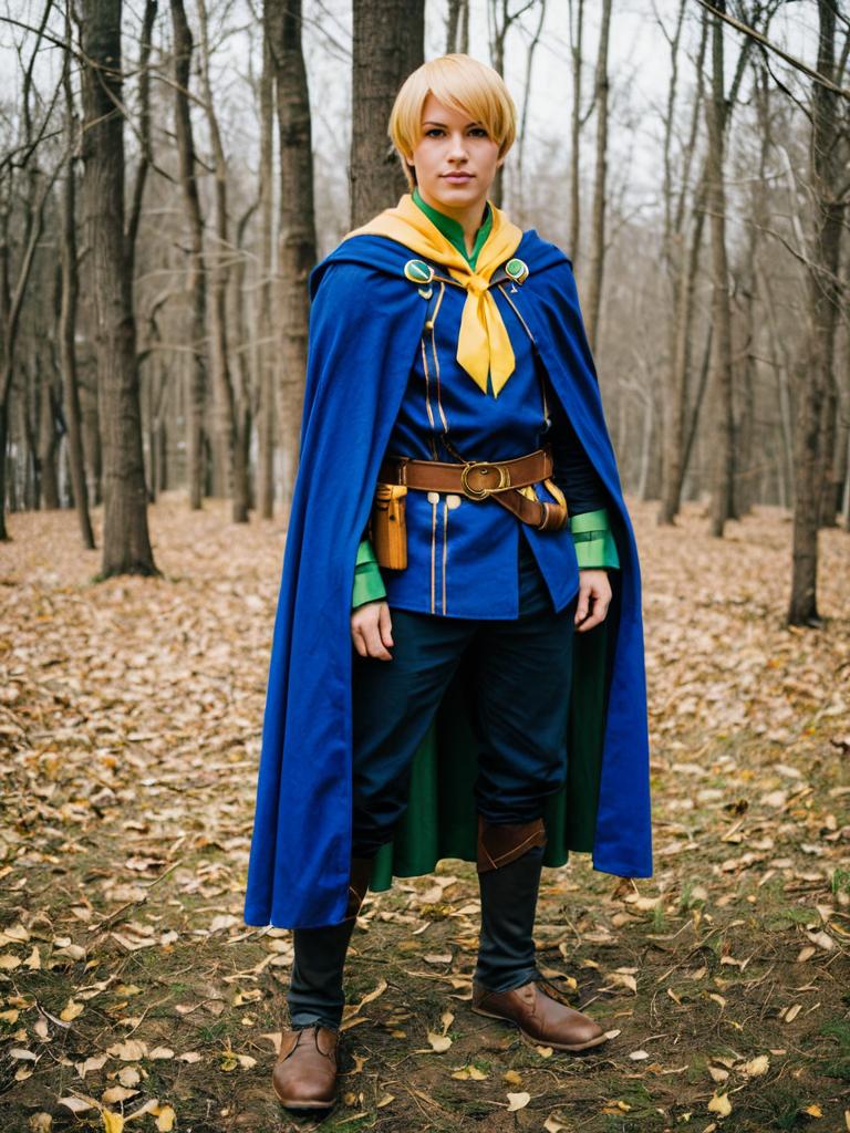 Photo-realistic cosplay photo of person in alfred (fire emblem) costume. 1boy, green eyes, blonde hair, short hair, blue cape, long sleeves, yellow ascot, circlet. full body shot
