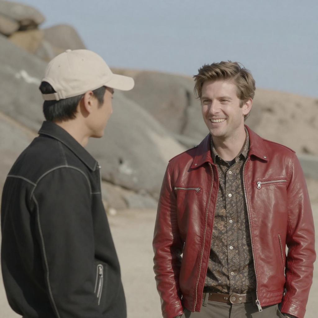 Photograph of two men standing outdoors against a rocky background. Man on right, with light brown hair, wearing red leather jacket and patterned shirt, smiling. Man on left, with black hair, wearing beige cap and black jacket with white stripes, facing away. Rocky hills in background. Clear blue sky. Casual conversation.