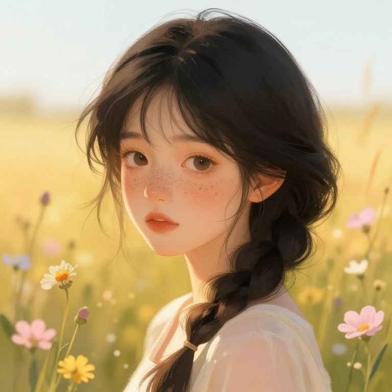 Black hair with freckles, an artistic digital painting of a girl with shiny black hair tied loosely, her face sprinkled with tiny freckles, illuminated by golden hour sunlight, surrounded by wildflowers and soft pastel colors, evoking warmth and innocence.