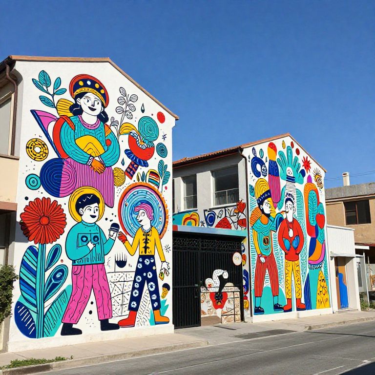 Free art images featuring a whimsical outdoor scene with colorful murals painted on urban walls, lively street art style, diverse characters and intricate patterns, dynamic composition with a playful, creative vibe, bright sunlight and clear blue sky
