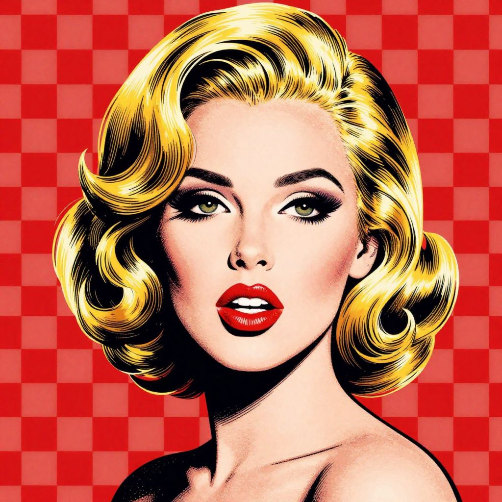 Vibrant pop art portrait featuring a woman with voluminous blonde curls, bold red lips, and a striking red checkered background, rendered in a stylized line-drawing technique.