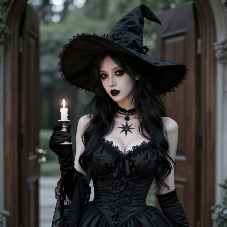 Photograph of a gothic witch in a black, low-cut dress with lace details and a large, pointed hat. She has pale skin, dark makeup, and long black hair. She's holding a candle in black gloves, with a star tattoo centered on her chest. The background shows a wooden door and blurred greenery outside. The image has a dark, mysterious vibe.