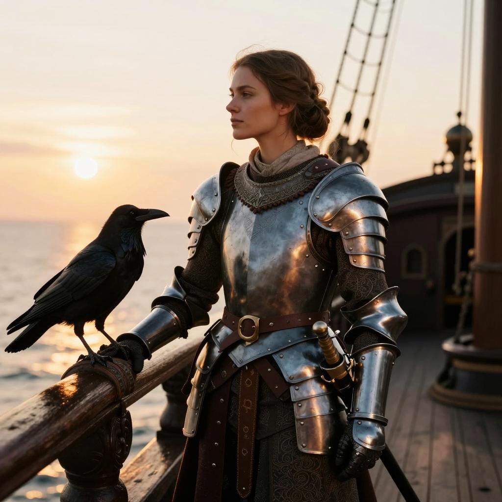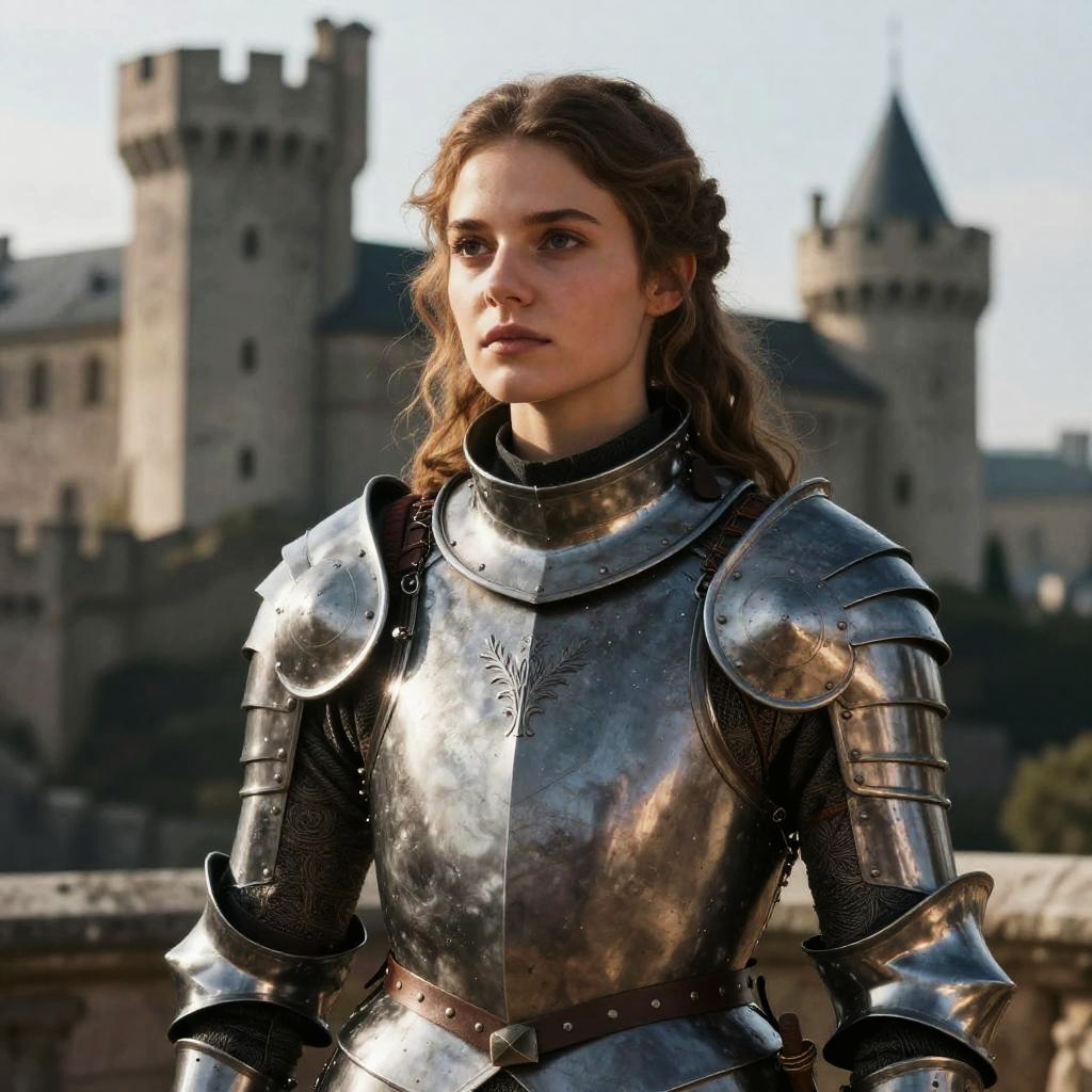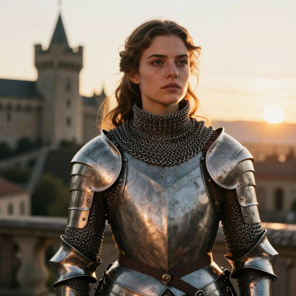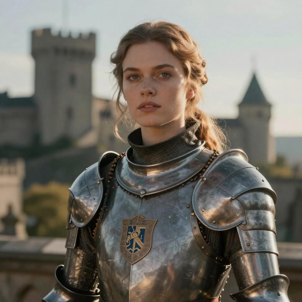 (masterpiece), (extremely intricate:1.3), (realistic), portrait of a girl, the most beautiful in the world, (medieval armor), metal reflections, upper body, outdoors, intense sunlight, far away castle, professional photograph of a stunning woman detailed, sharp focus, dramatic, award winning, cinematic lighting, volumetrics dtx, (film grain, blurry background, blurry foreground, bokeh, depth of field, sunset, motion blur:1.3), chainmail