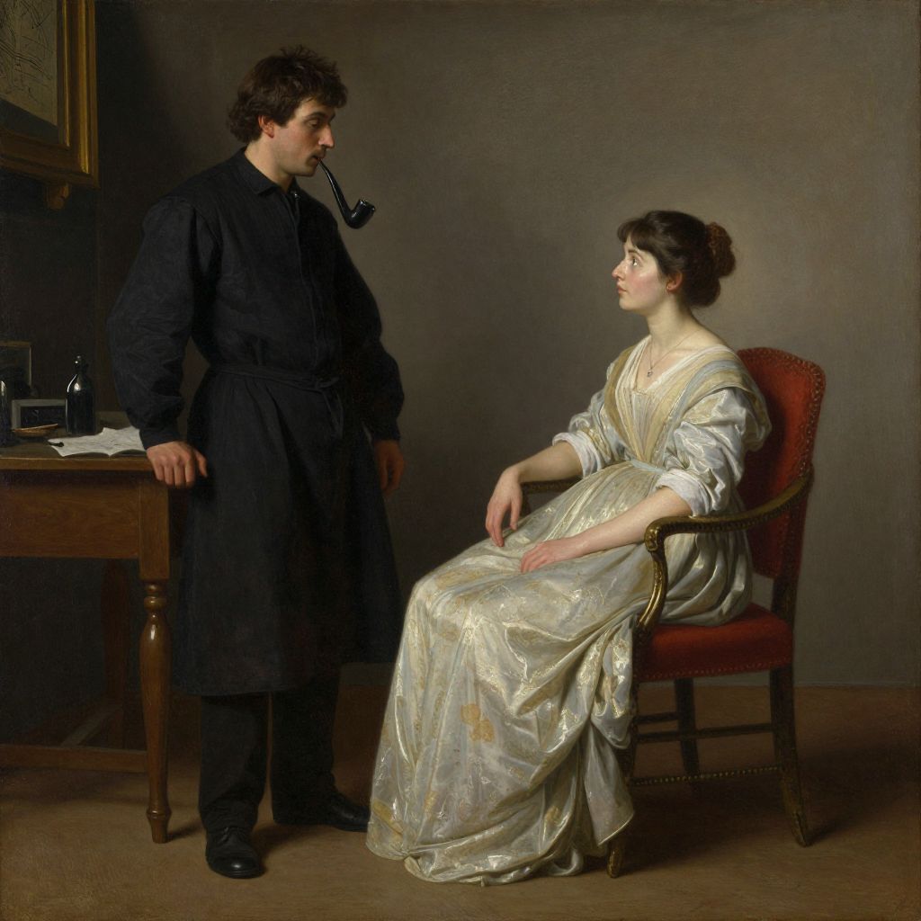 A classical oil painting reminiscent of Rembrandt's style depicts a solemn indoor scene where a man in a dark apron stands beside a table, holding a pipe, while a woman in a light gown sits on a red chair, her gaze directed toward him, illuminated by soft, dramatic lighting that enhances the intimate atmosphere.
