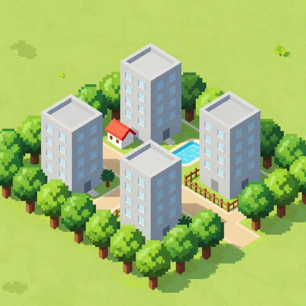 This is a digital, isometric, pixel art image depicting a small, green, grassy area surrounded by three white, rectangular apartment buildings with blue window frames. At the center, there is a small, rectangular swimming pool with blue water, and a red-roofed building adjacent to it. The buildings are surrounded by evenly spaced, pixelated green trees. A beige pathway runs along the right side of the buildings, bordered by a brown wooden fence. The image has a bright, colorful, and simple style, typical of 8-bit video game graphics.