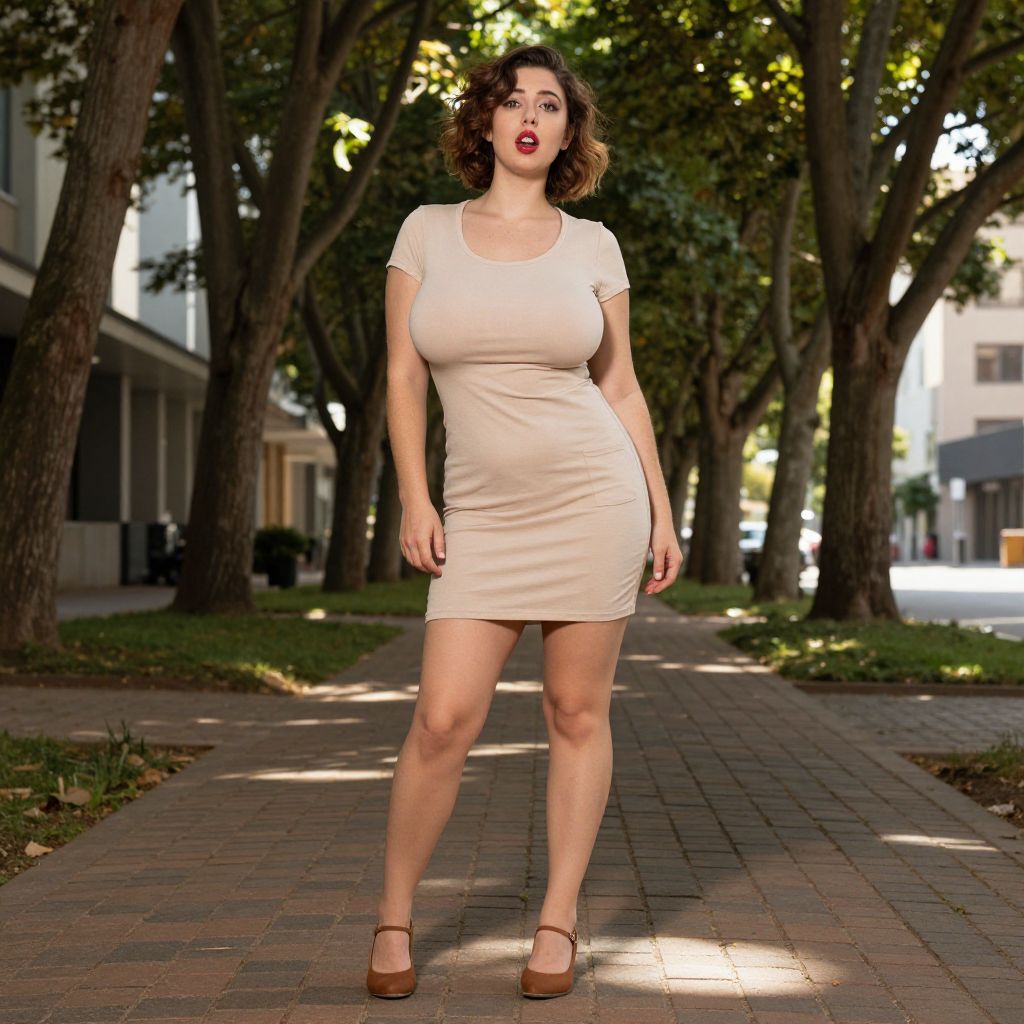 Photograph of a curvy woman with short brown hair, wearing a tight beige dress and brown heels, standing confidently on a sunlit, tree-lined