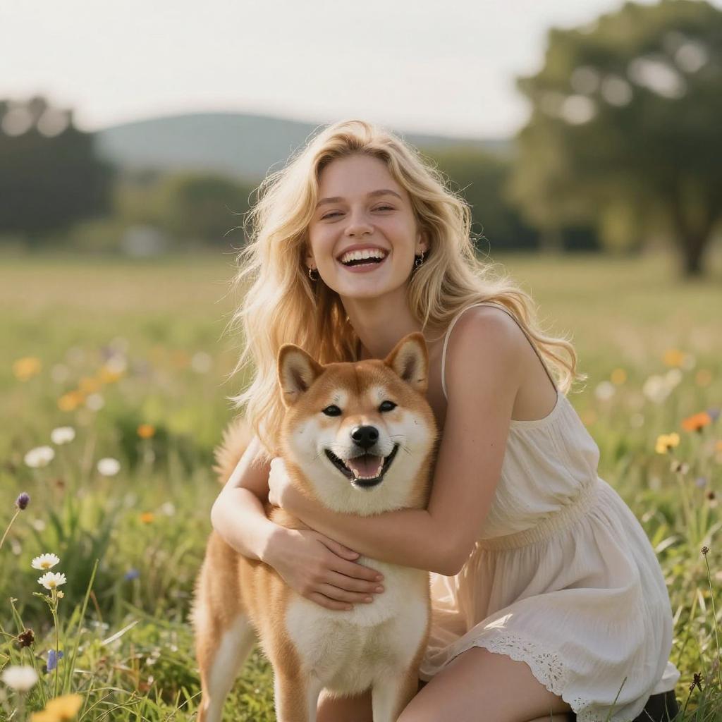 Young woman in a park, lifestyle stock photography style, happily hugging her dog, both smiling and laughing, tall blonde woman with loose beachy waves wearing a light sundress, with a shiba inu dog, in open grassy field with wildflowers and soft distant hills, warm natural light, soft bokeh background, vibrant colors, high resolution, ultra-detailed