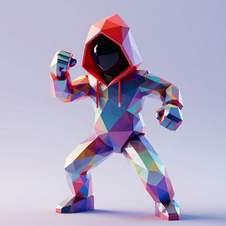 This is a digitally rendered, geometric-style illustration of a humanoid figure in a dynamic fighting stance. The figure is composed of multicolored, faceted polygons in shades of blue, red, white, and purple, creating a vibrant, crystalline appearance. It wears a hooded jacket with a red hood and a black, featureless face. The figure's fists are raised in front of its chest, and its legs are spread apart, suggesting readiness to attack. The background is a gradient from white to light blue, adding depth and contrast to the figure. The overall style is modern and abstract, with a high-contrast, neon-like aesthetic.