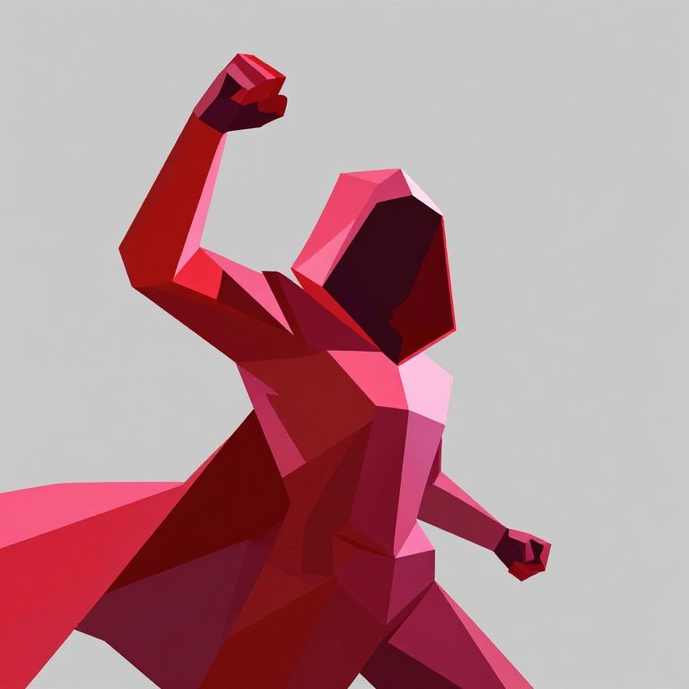 Geometric, digital illustration of a hooded, faceless figure in a dynamic, fighting stance, with colorful, faceted armor and a red hood