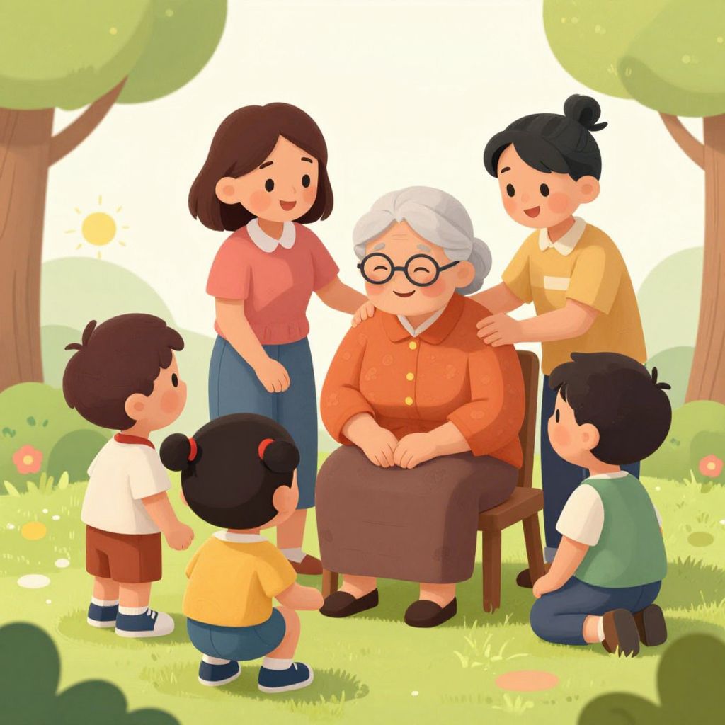 In this vibrant illustration, a group of children and parents are engrossed in a large, open book surrounded by lush greenery. The scene is set against a soft, pastel background, creating a serene and inviting atmosphere. The children, each with distinct hairstyles and clothing, are gathered closely around the book, their faces illuminated by the warm glow emanating from the pages. The parents, one holding the book and the other standing nearby, appear to be guiding the children through the story. The book itself is detailed with illustrations and text, suggesting it is a rich source of information or entertainment. Surrounding the group are various plants and leaves, some of which are animated with small creatures like butterflies and birds, adding a sense of life and movement to the scene. The overall composition is balanced, with the book at the center, the children and parents forming a semi-circle around it, and the greenery framing the scene, creating a harmonious and cohesive visual narrative.