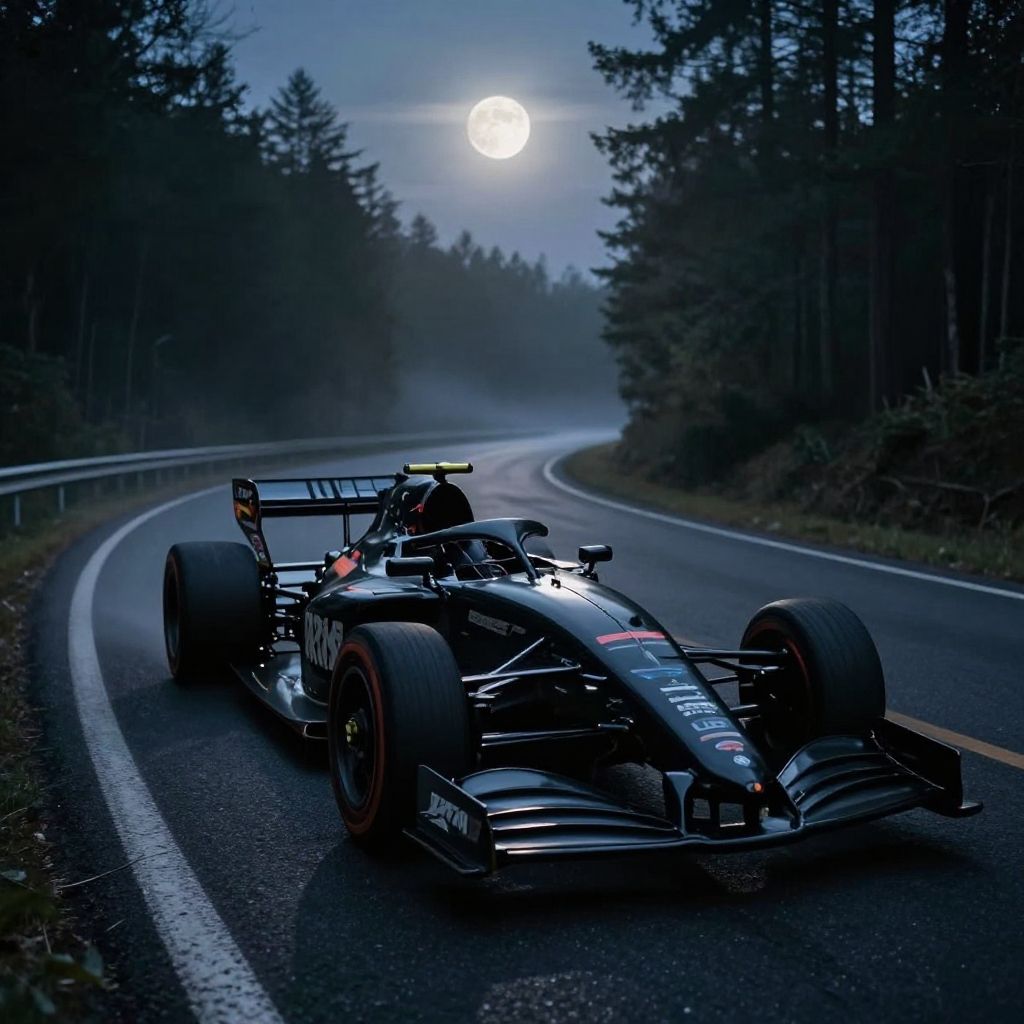 Batimobil racing across a deserted highway cutting through a dark forest, moonlight shining on polished black surfaces, fog and eerie atmosphere, ultra realistic style