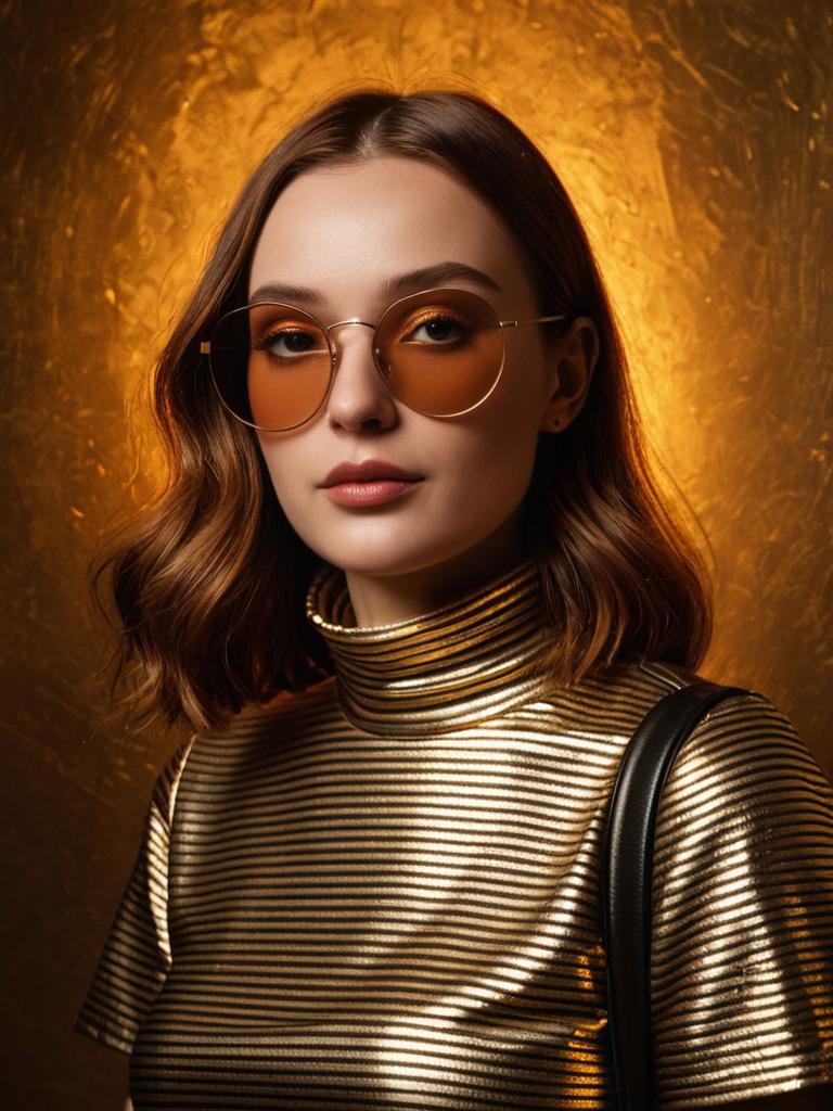 Portrait of a young woman with auburn hair styled in soft waves, wearing large round amber-tinted sunglasses. She is dressed in a metallic gold and black striped high turtleneck top with short sleeves, carrying a simple black shoulder bag. The background features a textured golden tone, enhancing the retro mod fashion vibe.