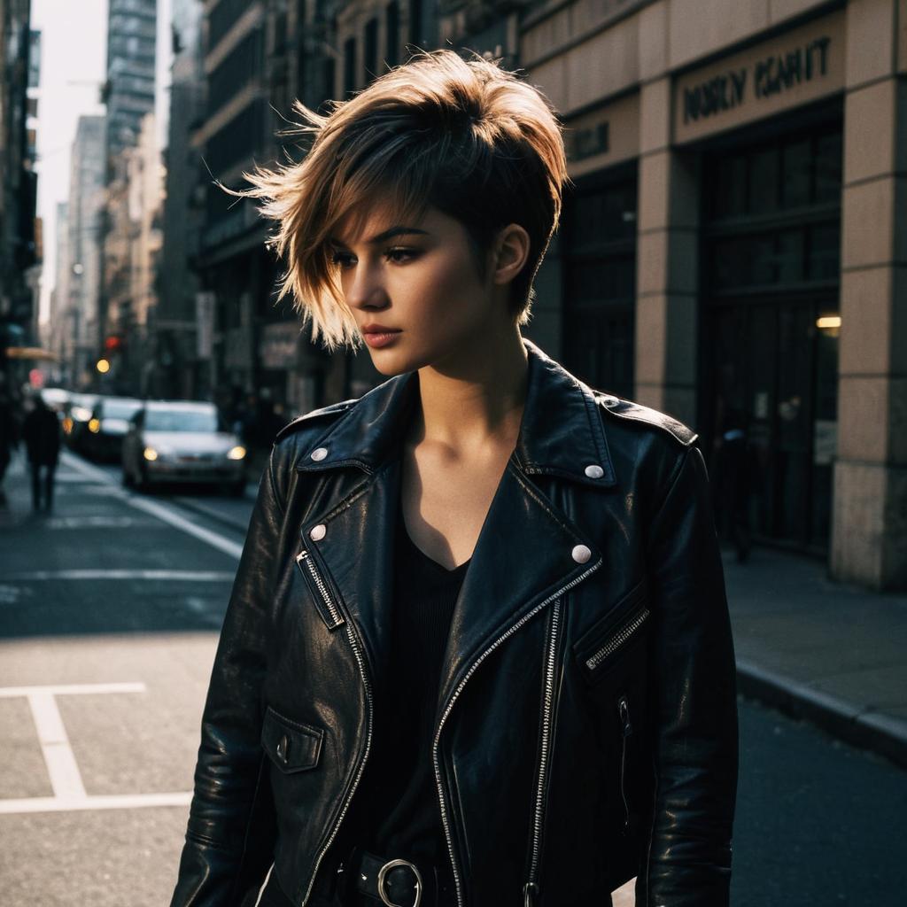 Messy Hair hairstyle on fashion model, wearing vintage leather jacket, in urban street, captured in fashion editorial style with golden hour sunlight.
