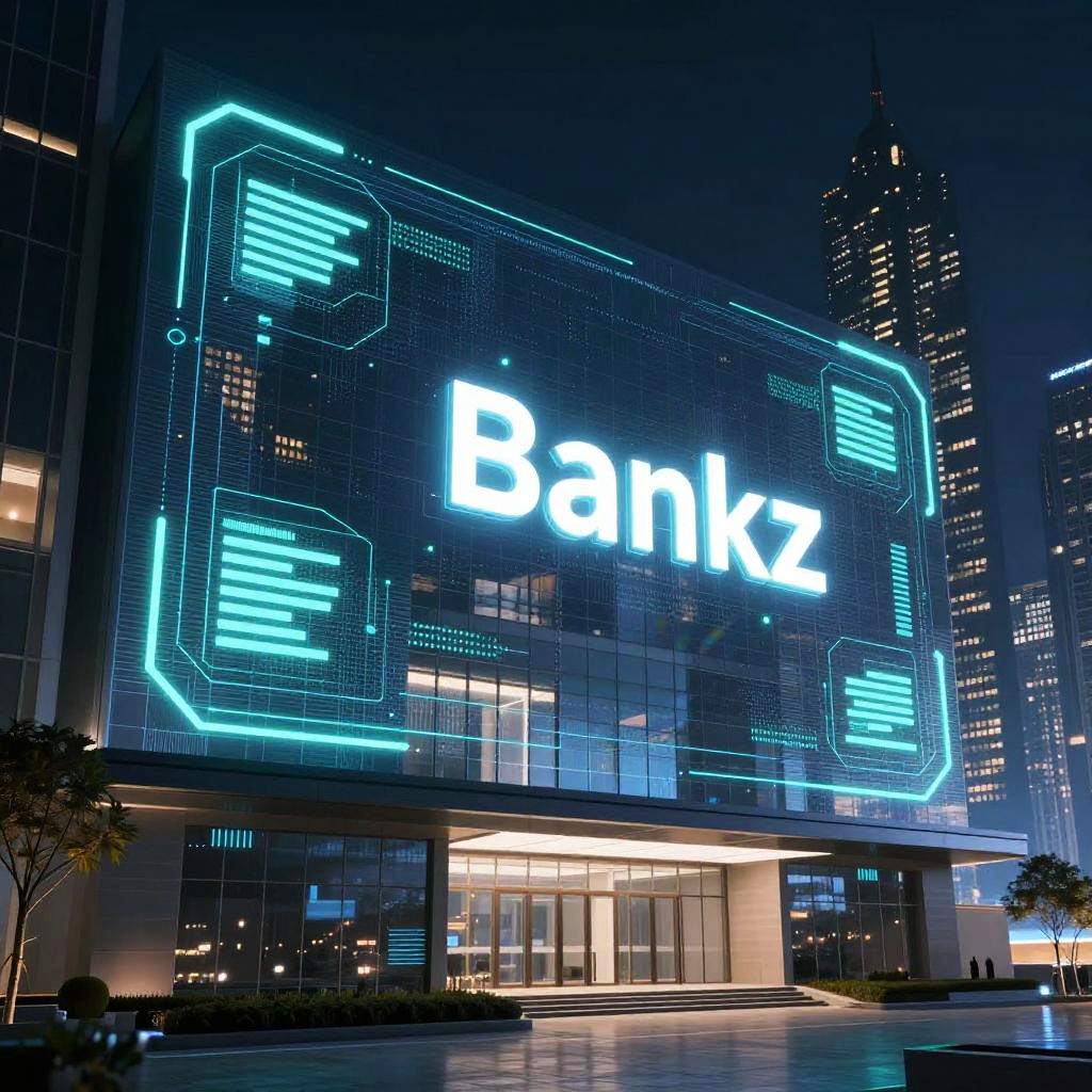 Bankz depicted as a futuristic digital bank interface, neon blue and green holographic displays, sleek modern architecture in a bustling cyber city, detailed high-tech security features, nighttime with glowing city lights, ultra-realistic style