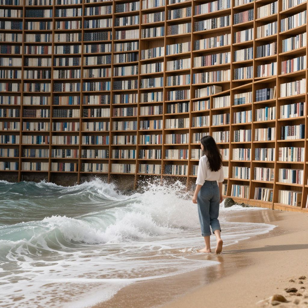 A woman strolls along a surreal shoreline where the waves meet endless bookshelves, blurring the boundary between the ocean's embrace and the infinite expanse of knowledge.
