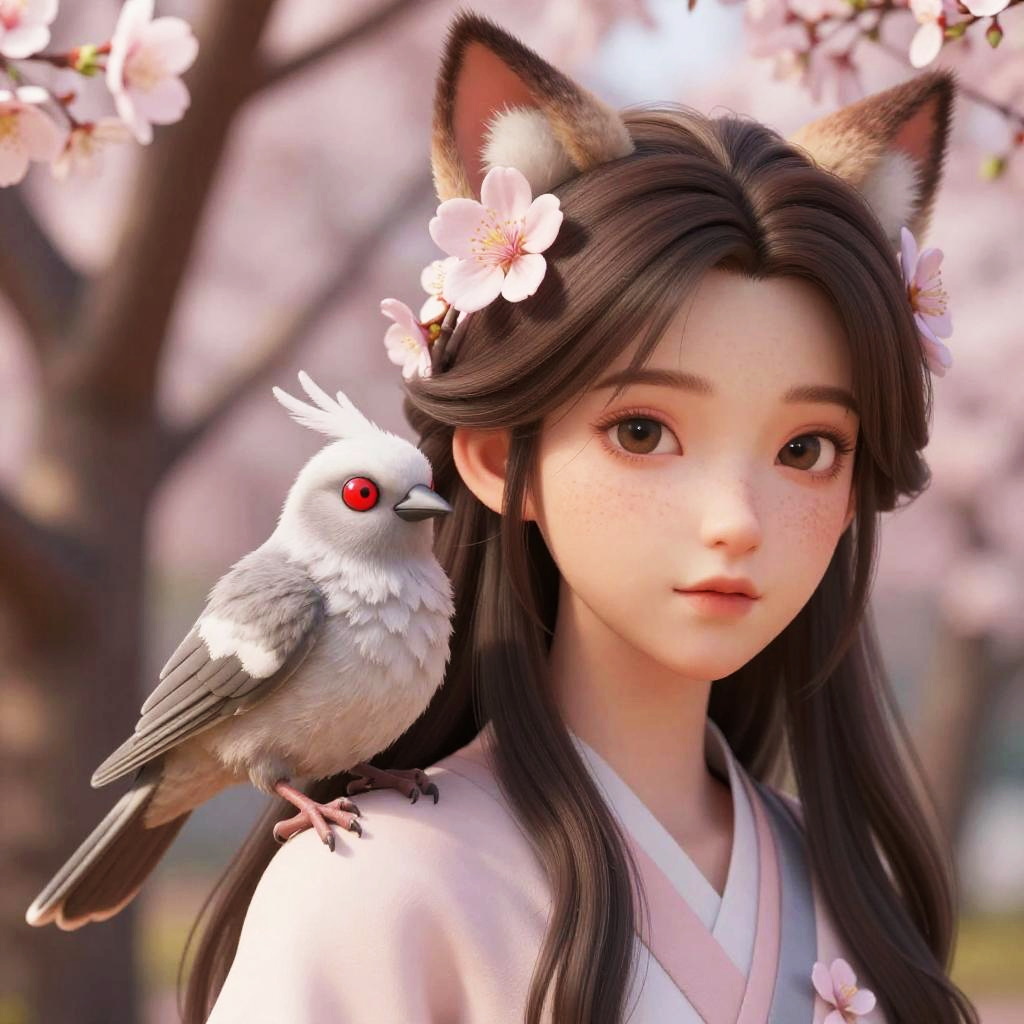 Photorealistic digital artwork of an Asian woman with long, dark brown hair adorned with pink cherry blossoms. She has large, cat-like ears with brown fur and wears a white traditional kimono. A small bird with white feathers and a striking red eye perches on her left shoulder. The background features soft-focus cherry blossom trees in full bloom, creating a serene, springtime atmosphere. The woman's delicate features include large, expressive brown eyes and a gentle expression. The lighting is soft, enhancing the natural beauty and tranquility of the scene.
