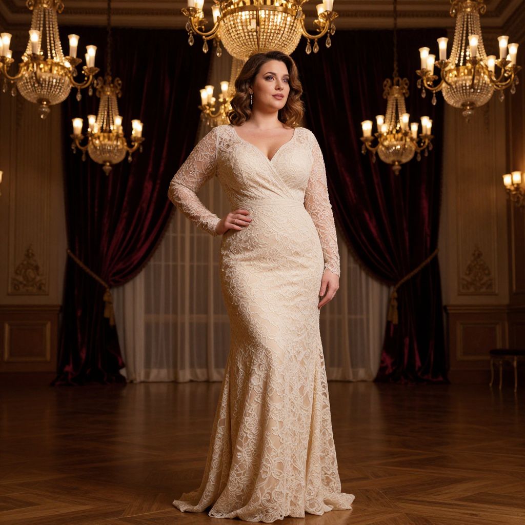 Photograph of a smiling blonde woman in a white, lace-trimmed, V-neck wedding gown with a voluminous, tulle skirt. She stands in an opulent, elegantly decorated room with gold-framed mirrors and chandeliers. Candles on ornate stands add warm light to the background. Her hair is styled in loose waves, and she wears a delicate necklace. The room's walls are cream-colored, and the floor is polished. She holds the sides of her skirt outwards, showcasing its fullness. The overall atmosphere is luxurious and romantic.