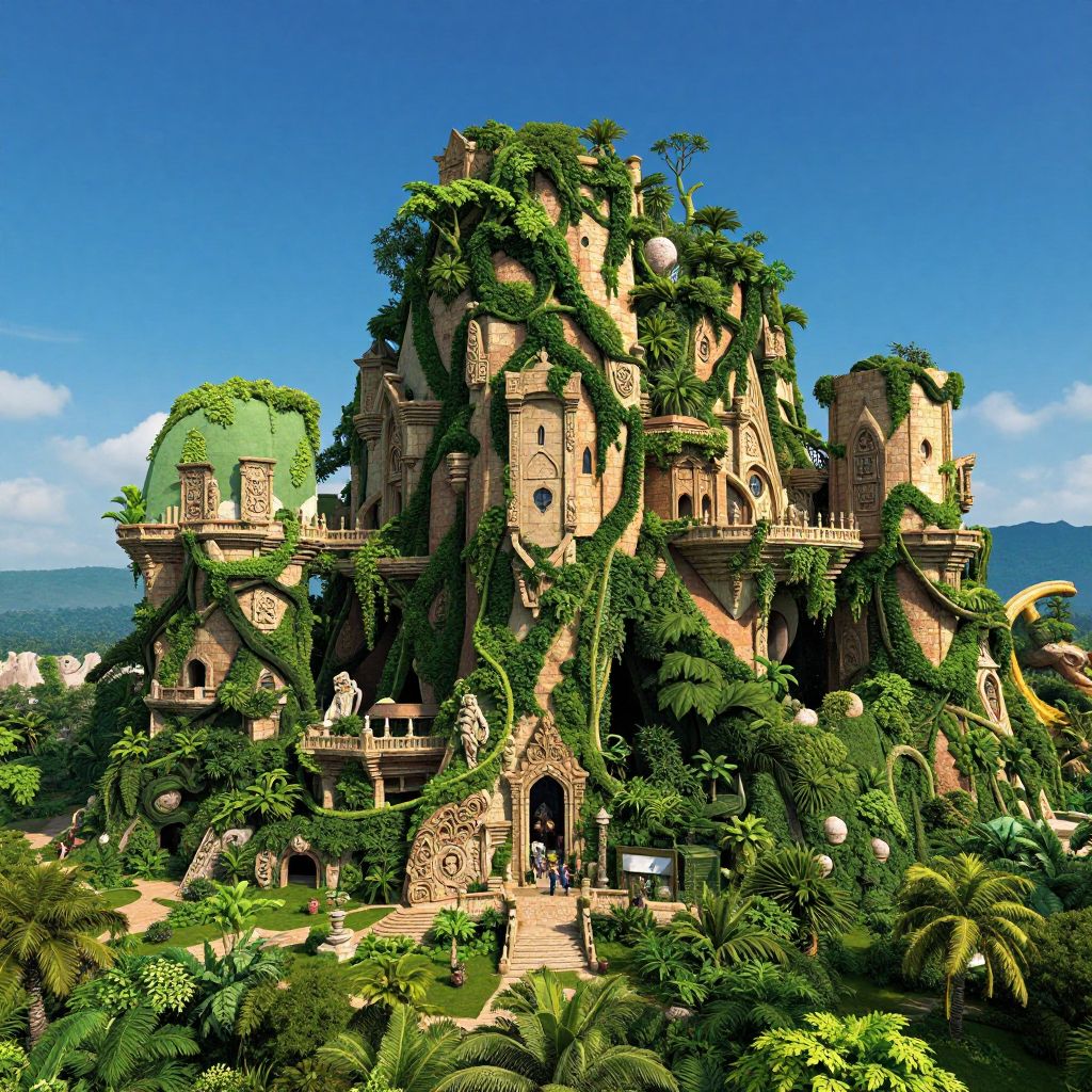 Envision a whimsical village nestled atop an intricate, spiraling staircase that appears to stretch endlessly into the sky, as viewed from a peculiar perspective. This architectural marvel is adorned with unique structures on each level, showcasing a kaleidoscope of vibrant colors that create a surreal atmosphere. The inhabitants move about their day in an animated style, exuding curiosity and joy as they interact within this fantastical realm. This imaginative community, brimming with life and eccentricity, invites the viewer to marvel at its defiance of logic and conventional perceptions of reality, evoking emotions ranging from awe to wonderment.