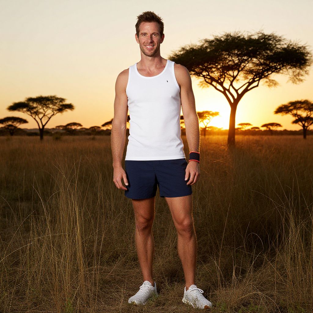 Photograph of a fit, middle-aged Caucasian man with short brown hair and a slight beard, standing in a savanna at sunset. He wears a white tank top, dark blue shorts, white sneakers, and a black wristband on his left wrist. The background shows tall grass, silhouetted acacia trees, and a vibrant orange and yellow sunset. His stance is relaxed with arms slightly apart and a slight smile on his face. The scene is backlit by the setting sun, casting warm, golden light.