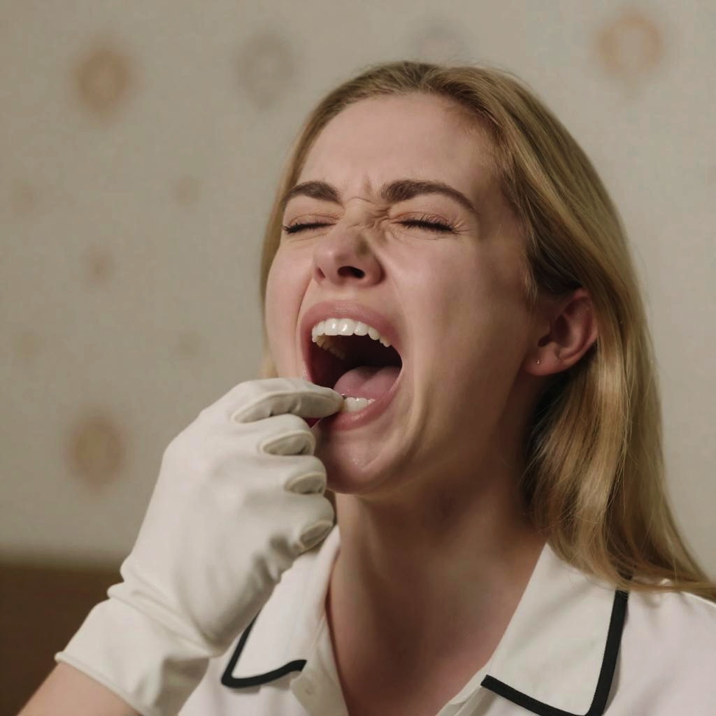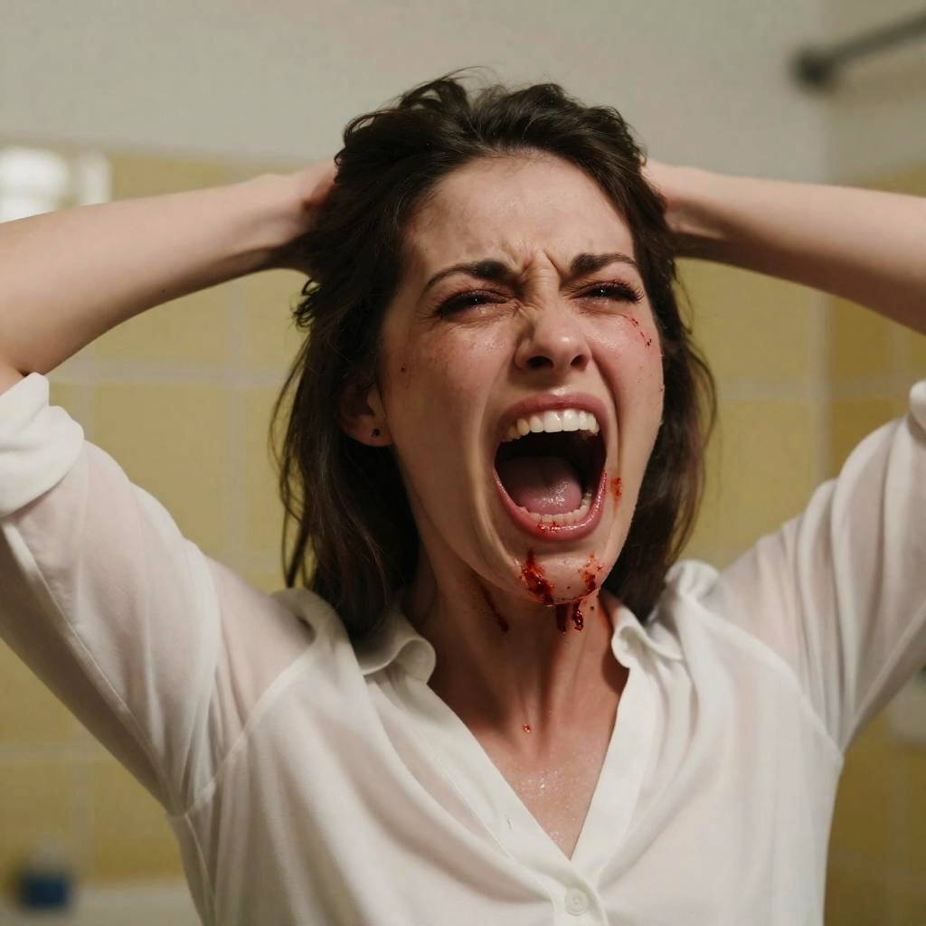 Photograph of a woman with dark brown hair, screaming with mouth wide open, blood covering her face and white blouse. She raises both arms, hands behind head. Background has yellow-tiled walls and blurred objects. Intense facial expression.