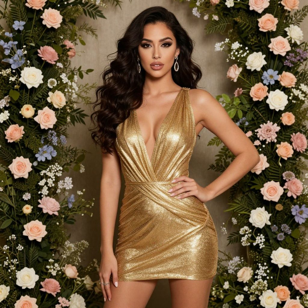Photograph of a woman with long, wavy black hair and tan skin standing in front of a floral backdrop. She wears a sparkling, gold, deep V-neck mini dress that hugs her hourglass figure, accentuating her medium-sized breasts and slim waist. She has large, dangling gold earrings and a confident expression. The background features an array of colorful flowers including roses, peonies, and daisies, framed by lush greenery. The lighting highlights the shimmer of her dress, creating a glamorous, elegant vibe.