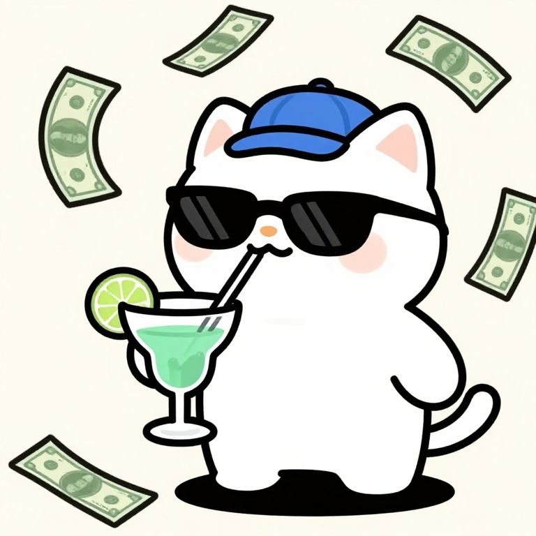 Cartoon white cat with blue cap, black sunglasses, and lemon drink, surrounded by flying money bills, sipping with a straw.